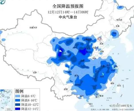 受寒潮影响,12月12日14时至14日8时,我国中东部地区将自西向东出现大风降温,日平均或最低气温普遍下降6~8℃,青海东部、甘肃东部、内蒙古西部、陕西北部、山西西部、江南北部以及广东北部等地部分地区下降10~12℃,局地降温可达12~14℃。12月14日早晨,最低温度0℃线将南压至浙江南部、江西北部、湖北南部一带。