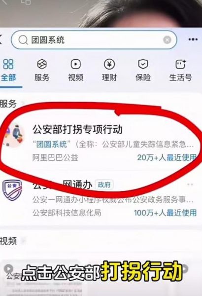 扩散这条信息,一定要转发给身边所有有孩子的家庭。多一个人知道小朋友就会少一份危险。可能你不知如果小孩子不见了是可以不用等到24小时之后再去报警的。现在的交通发达24小时后可能黄花菜都凉了。大陆的公安部和阿里巴巴共同打造的团圆系统,找回率高达98%。现在呢,我就给你分享具体是如何操作的,你仔细看好了。首先呢,打开我们的支付宝,点击左上角的搜索。输入“团圆系统”,然后点击“公安部打拐行动”,